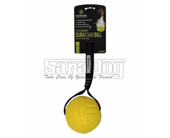 Starmark® GripCord Durafoam Ball Cord L , minge pentru dresaj canin , confectionata din spuma cu densitate ridicata , rezistenta , prevazuta cu banda atasata pentru aruncari la distante mari . Spuma cu densitate ridicata din care este confectionata mingea este rezistenta la muscaturile cainilor , sigura pentru dintii cainilor , nu retine apa , mirosuri , bacterii sau murdarie .