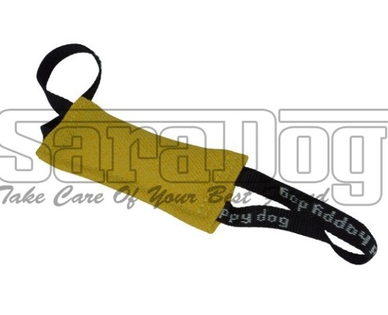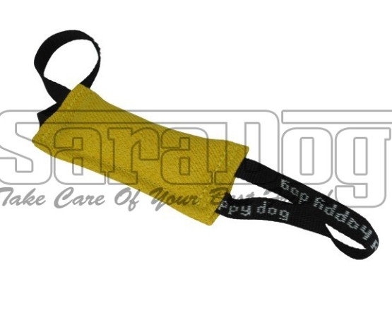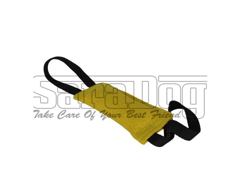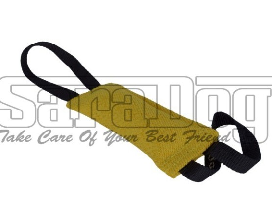 Tug pentru dresaj canin , confectionat din material francez de calitate premium , prevazut cu doua manere laterale . Materialul francez utilizat la confectionarea acestui tug pentru dresaj canin este de calitate premium , fiind identic cu cel utilizat la confectionarea costumelor profesionale de muscatura . interiorul tug-ului este umplut cu fibre de silicon hipoalergenice foarte sigura pentru caine , nu retina umiditatea si asigura revenirea rapid la forma initiala a tug-ului imediat ce a fost eliberata muscatura . Marginile tug-ului sunt cusute durabil , cusaturile fiind dublate pentru extra rezistenta . Ata cu care este realizata cusatura este speciala fiind rezistenta la saliva cainilor . Manerele laterale sunt confectionate din banda rezistenta dubla cu tesatura densa pentru o buna rezistenta si pentru o prize optima in timpul utilizarii . In plus , interior manerul are prevazute insertii de cauciuc pentru aderenta sporita chiar si in timpul utiizarii pe vreme umeda . Latimea de 8 cm si lungimea de 20 cm recomanda utilizarea acestui tug pentru antrenarea atat ca cainilor puppy si junior , cat si a cainilor adulti . Densitatea tug-ului este semi-dura asigurant astfel formarea unei prize corecte . Manerele laterale ajuta la echilibrarea prizei , cat si la formarea unei muscaturi adanci , centrate .