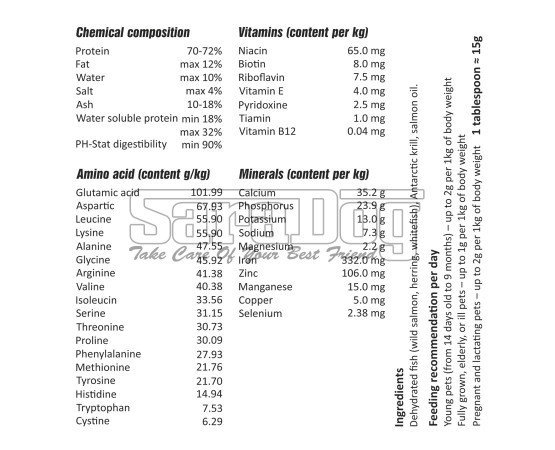 Include produse marine valoroase : peste deshidratat din marile nordice ( somon , hering , cod , Scomber ) , krill de Atlantic si ulei de somon .